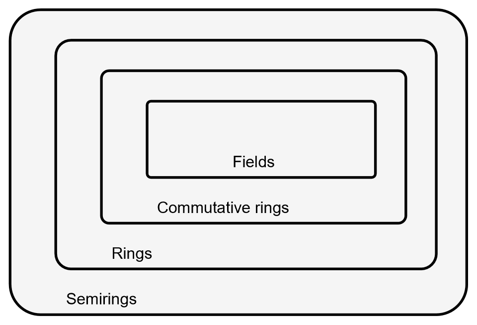 Let’s consider some examples. The natural numbers (0, 1, 2, …) are a semiring—they are not a ring, because they don’t have additive inverses. The integers are a ring because they do—moreover, they are a commutative ring, because the multiplication is commutative. But they are not a field, because they don’t have multiplicative inverses.