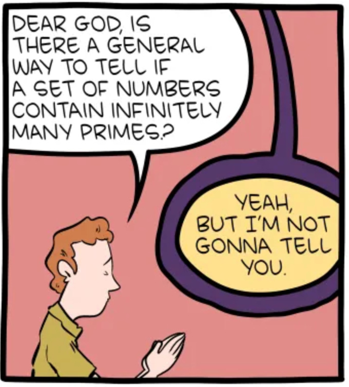 In a certain highly trivial sense, of course there is a way to tell whether a set of numbers contains infinitely many primes: look through all of them and count how many primes there are. But this is useless to us humans, because we don’t have a way to go through the entirety of an infinite set—it would take us, literally, forever. So, instead, I am going to interpret this as asking whether there is some algorithm using which we could take a set of numbers and determine whether it contains infinitely many primes (in finite time).